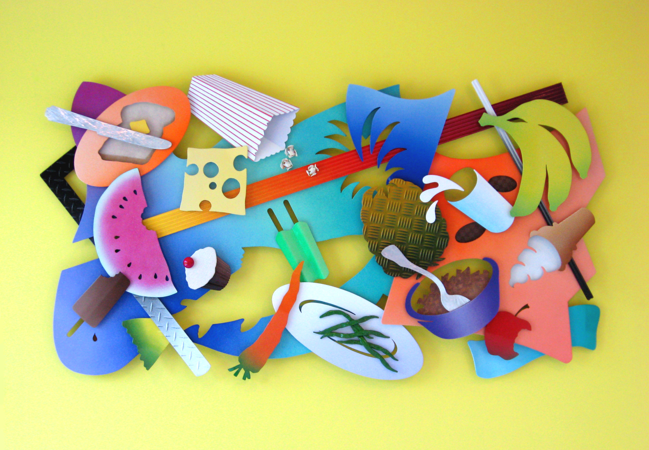 “EAT YOUR BEANS!” is a fun wall sculpture commissioned by the Florida Art in State Buildings Program for a waiting room of the Tampa Children’s Medical Services Clinic. The subject matter and intense color scheme is designed to appeal to children and provide a welcome distraction and conversational focus point for a child waiting in a tense and uncomfortable setting. Of all the food items depicted there is only one that I can imagine a mother would have to admonish a kid to eat – beans!