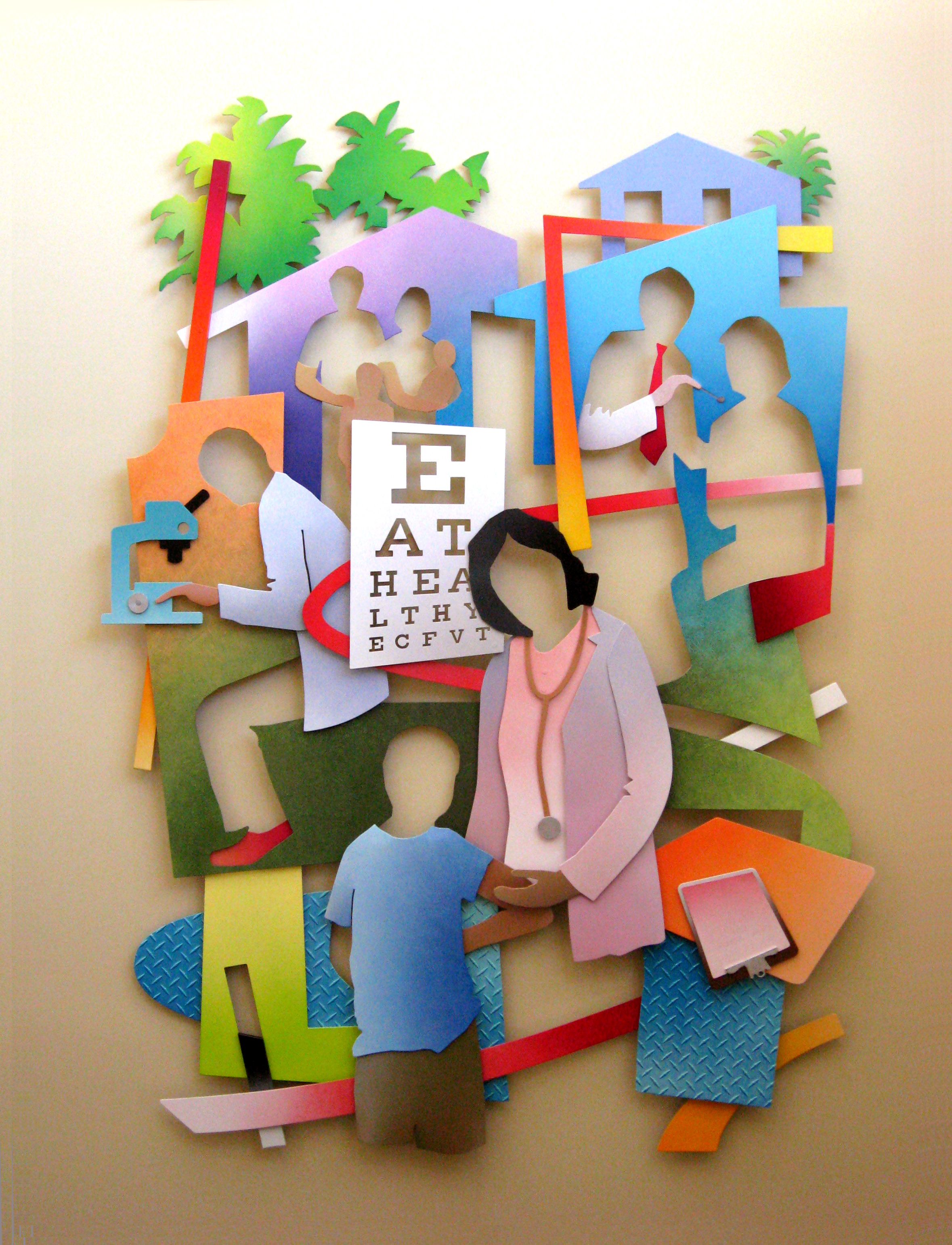 “HERE TO HELP no.2” was commissioned by the Florida Art in State Buildings Program for the Hernando County Florida Department of Health Clinic. It depicts some of the health care practices available at the clinic.