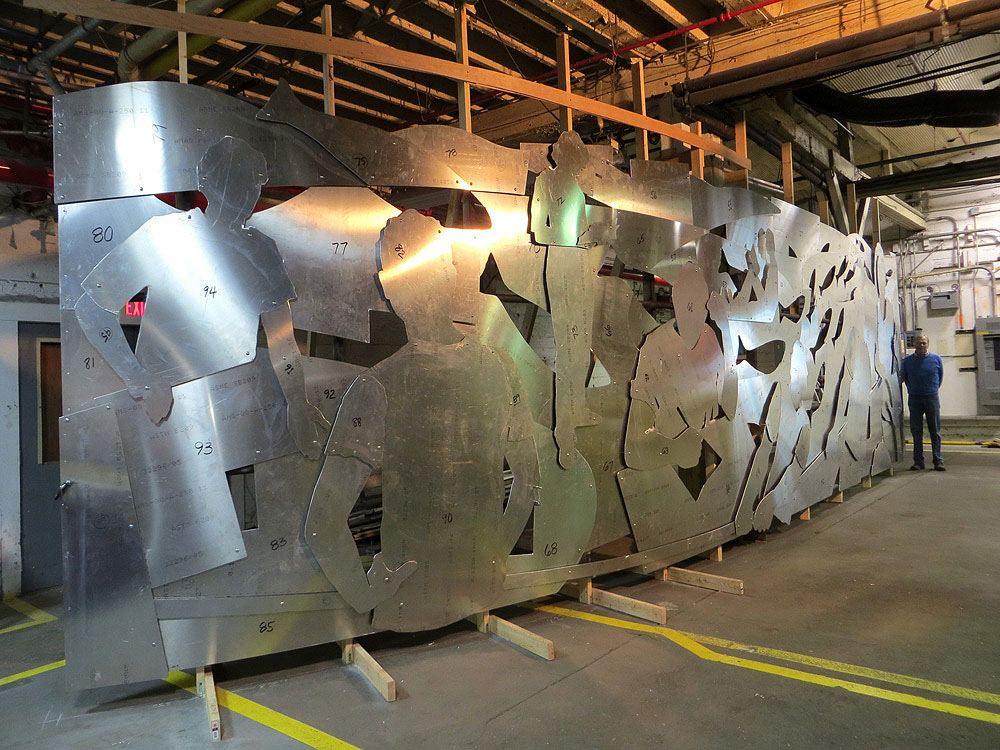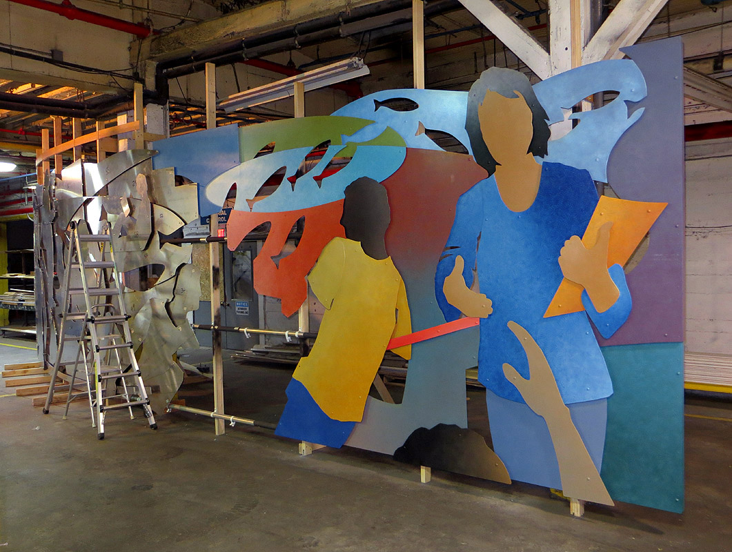 “SWIMMING UPSTREAM” is a relief sculpture screen commissioned by the State of Alaska Public Art Program for the Johnson Youth Center, a juvenile justice correctional facility and school in Juneau, Alaska. The composition incorporates imagery of larger than life figures engaged in gestures of positive interaction, civility, communicating, studying and co-operating in work tasks. (All aims of the work done here with its residents.) The migrating fish pattern woven through the length of the design is a reference to both a wild salmon stream that runs alongside the facility and the “Swimming Upstream” struggle many of the kids residing here have had in life.